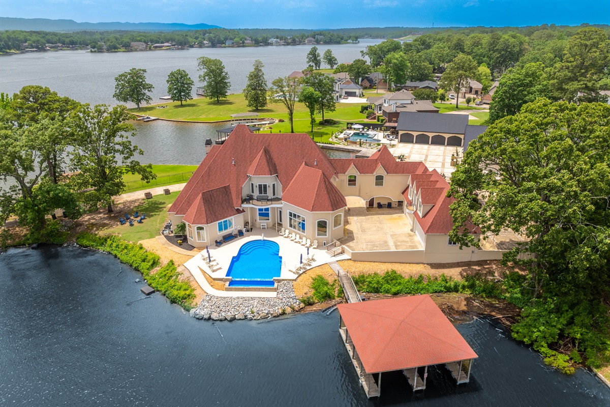 The primary retreat is a spa-like haven, offering pool and lake views, walk-in closets, a spacious walk-in shower (wheelchair/handicap friendly), and a jetted tub facing a large flat screen TV. Bedrooms are generous, with separate guest quarters and a spacious bunk room with 1.5 bathrooms. The property accommodates 24 guests in beds, provides dual wireless internet, and features smart TVs in every bedroom. An infinity pool overlooks Lake Hamilton, and a double stall covered lighted boat dock completes this luxurious getaway.